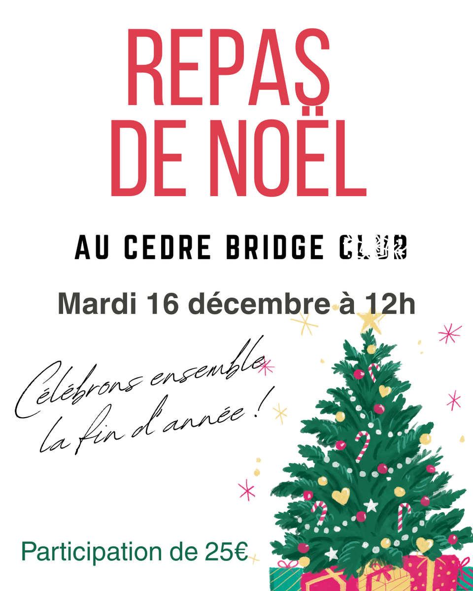 Pour fêter la fin de l'année 2025, nous organisons un déjeuner de Noël à 12h avant le tournoi Venez nombreux : participation 25€